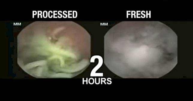 ▲食物吃下肚 20 分鐘時,泡麵還沒有被分解,一般的食物已經開始變成碎末。(圖/翻攝自 YouTube )